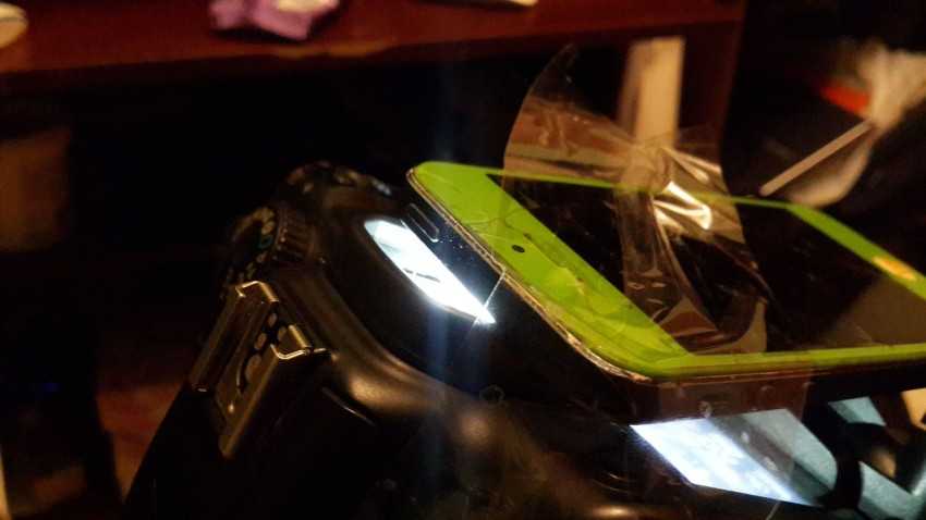 Линза с прокладкой замечательно встала на место кабашона. Осталось только совместить с ней объектив камеры. Что удивительно, смартфон сам наводит объектив на резкость, учитывая ещё один оптический элемент. Как он это делает, для меня осталось загадкой.