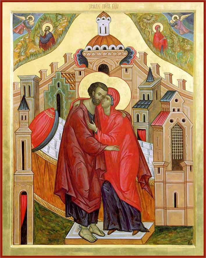 Тот же Ангел Господень явился и праведному Иоакиму, сказав ему: “Бог милостиво принял твои молитвы. Жена твоя Анна зачнет и родит дочь, о которой весь мир будет радоваться. Вот и знамение верности моих слов: иди в Иерусалим, и там у Золотых ворот ты встретишь свою жену.”