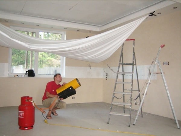 После доставки всех необходимых материалов в помещение клиента бригадой мастеров выполняется работа по установке потолка. К стенам крепится алюминиевая конструкция (багет). Затем к ней монтируется полотно ПВХ или материал на тканевой основе. Тепловой пушкой полотно разогревается до определенной температуры. При воздействии горячего воздуха материал растягивается и становится гладким. После того, как полотно выровнялось, специалист устанавливает плинтус. Аккуратно вырезаются отверстия под люстры, крепятся карнизы или другие потолочные изделия. После этого работу можно принимать.
