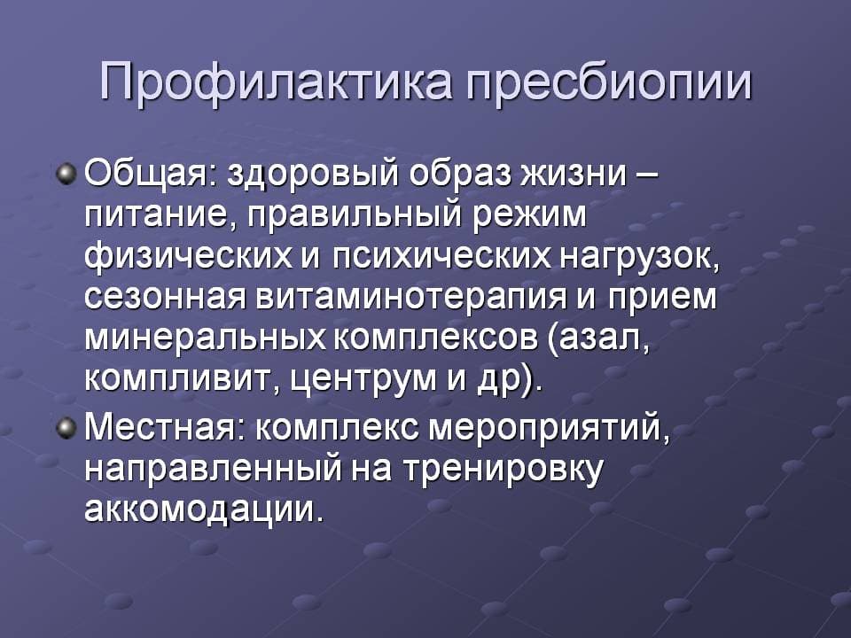 Предотвратить это заболевание невозможно, но можно предпринять попытку избежать неприятных последствий возрастной дальнозоркости: расплывчатость зрения, усталость глаз, головные боли. Для этого нужно провести своевременную коррекцию возрастной дальнозоркости очками, контактными линзами или хирургическим путём.
