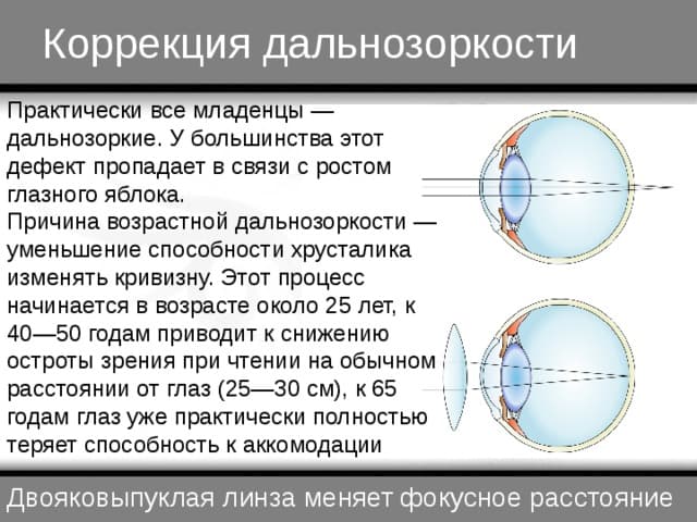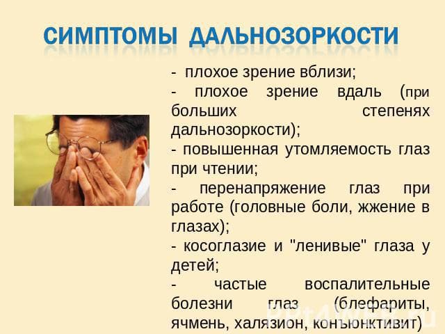 Близко расположенные изображения предстают перед ним в размытом, нечётком виде. При этом снижается его самочувствие, появляются головные боли, усталость глаз при длительном выполнении зрительной работы. Поначалу большинству людей помогает удаление текста на большее расстояние от глаз. Но рано или поздно человеку придётся обратиться за помощью к офтальмологу. Процесс этот может усугубляться вплоть до 65 – 70 лет, а пациент будет нуждаться в необходимости носить всё более сильные «плюсовые» очки или линзы. Врач поможет правильно для пациента.