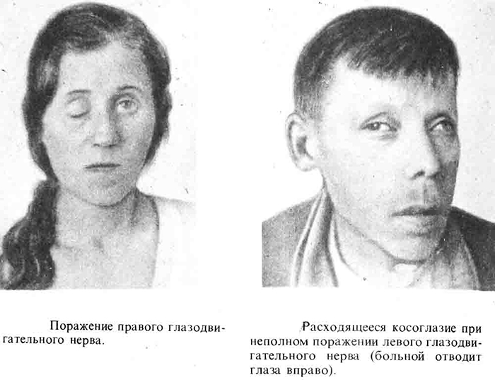 Клиническая картина этой формы нейросифилиса слагается из симптомов менингита и неврита или неври тов пораженных черепных нервов. Симптомы менингита выявляются в виде головной боли, усиливающейся в ноч ные часы и иногда сопровождающейся тошнотой и рво той. Ригидность затылочных мышц выражена слабо или отсутствует. Характерно поражение черепных нервов. Часто страдает глазодвигательный нерв с одной или обе их сторон. Начинается с птоза века, а затем присоединя ются поражения наружных и внутренних мышц глаза. Может также присоединяться поражение отводящего и блокового нервов. Нередко в процесс вовлекается слухо вой нерв, что ведет к поражению слуха, и тройничный нерв, что сказывается в первую очередь невралгическими болями в лице, парестезиями или понижением чувстви тельности. При поражении зрительных нервов может развиться неврит с последующей атрофией, ведущей к снижению остроты зрения вплоть до слепоты.