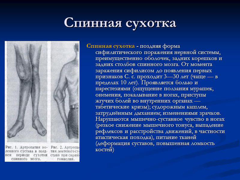 Поражение нервной системы на фоне позднего сифилиса может протекать по типу спинной сухотки. Это опасное состояние, характеризующееся повреждением задних корешков и канатиков спинного мозга. Данное осложнение развивается через 10–20 лет после заражения человека. Основными клиническими проявлениями спинной сухотки являются: