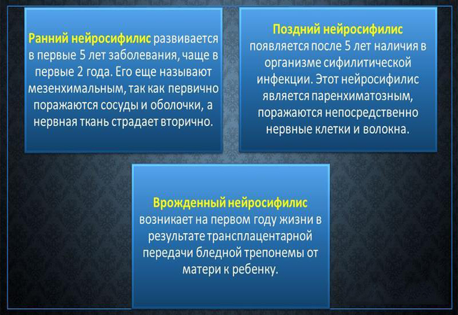 Нейросифилис принято делить на ранние и поздние формы. Такое деление основано на характере патоморфо логических изменений нервной системы и хронологиче ски не совпадает с обычной периодизацией сифилиса. Ран ний (мезенхимный) сифилис нервной системы выявляет ся в первые 5 лет болезни (в основном в первые 2–3 года), поздний (паренхиматозный) — не ранее 6–8 лет после за ражения.