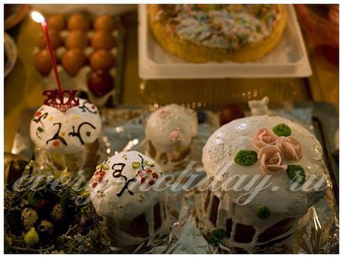 Неотъемлемыми атрибутами пасхального стола являются крашеные куриные яйца, пасхальные куличи и творожные пасхи.