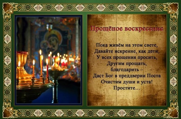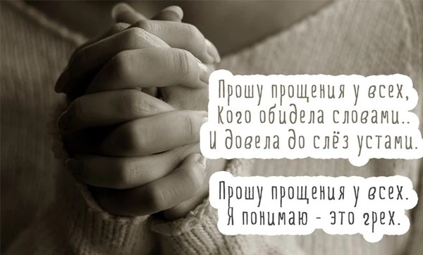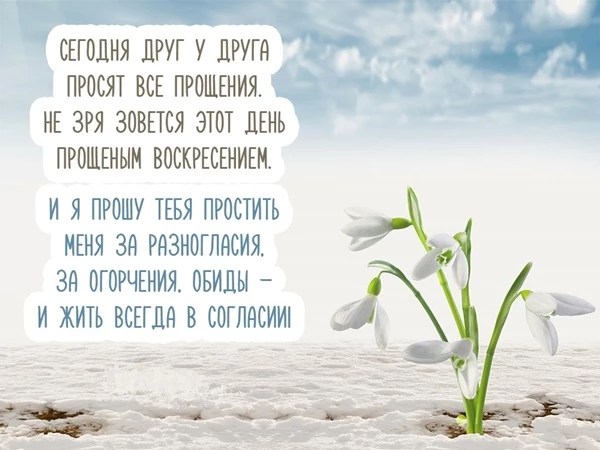 Последний день перед Великим постом настраивает верующих на покаянный лад. И сейчас люди искренне и со слезами просят друг у друга прощения в это воскресенье и отправляют трогательные открытки с надписями. Истоки этой традиции относятся ко временам древних египетских монахов, и так как многие не могли вернуться, они просили друг у друга прощения. Впоследствии этот обычай стал общецерковным. Трогательные до слез открытки с Прощеным воскресеньем с надписями приведены в подборке ниже.