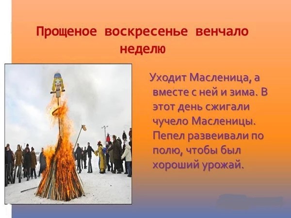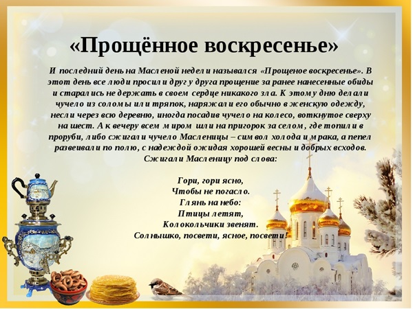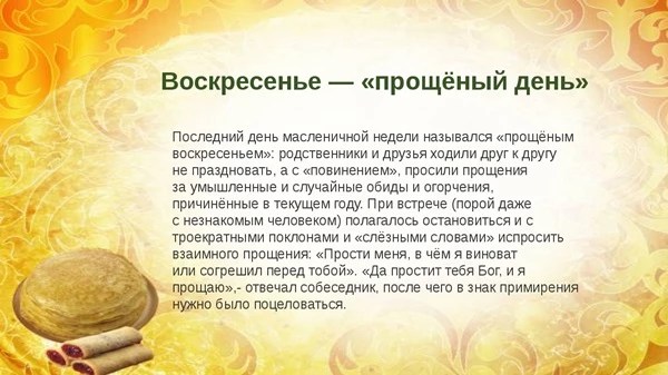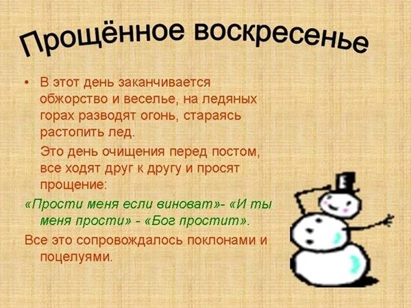 Когда люди ссорятся, их отношения становятся сложными, а если мы произносим «прости», мы упрощаем их, делаем добрее. Праздник Прощеное воскресенье о том, что Господь не простит наши грехи, если мы окажемся не в состоянии простить своих обидчиков. Просить прощения нужно осознанно, по-христиански, понимая зачем. В далеком благочестивом прошлом старший и властный просил прощения у младшего, особенно у того, кому чаще всего наносились обиды. Сейчас люди отправляют открытки с поздравлениями с Прощеным воскресеньем и Масленицей. Праздник напоминает нам о ценностях духовной жизни, которые позволяют нам благословить своих обидчиков. Никакое христианское дело, направленное на душеспасение, не будет осуществлено, если есть обида. Поэтому даже дальним знакомым нужно отправить в последний день Масленицы поздравительные открытки на Прощеное воскресенье.