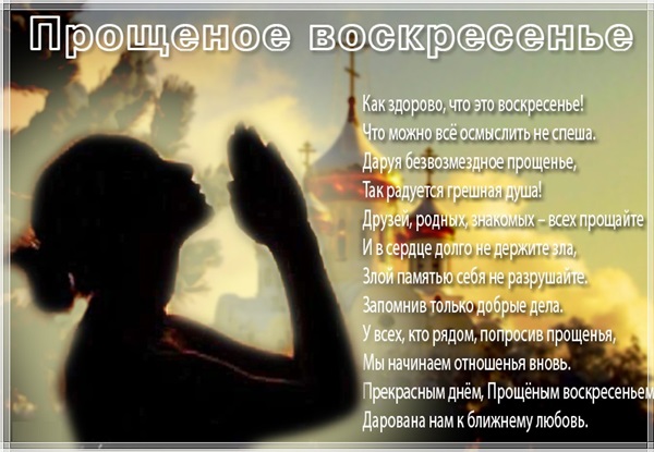 В 2018 году Прощеное воскресенье приходится на 18 февраля. Подготовьтесь к этому дню физически и морально: посетите храм, настройтесь просить прощение у родных людей за свои ошибки и у всего человечества за то что мы — плохие христиане. А еще, скачайте бесплатно самые красивые и трогательные до слез картинки с Прощеным воскресеньем 2018 с поздравлениями и символическими надписями, чтобы в нужный момент отправить маме, папе, мужу или парню, подруге, друзьям, коллегам и всем остальным.
