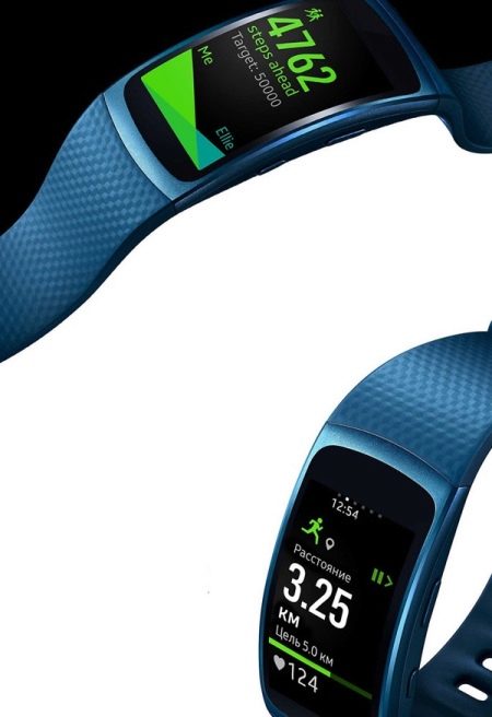 Изогнутый экран Super Amolet имеет дорогой фитнес-браслет Gear Fit 2 от Samsung. Это устройство позволяет устанавливать сторонние приложения, поэтому вы можете самостоятельно «собрать» необходимый для вас софт в одном устройстве.