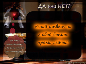 Ой, тут так написано, как мне моя бабка говорила когда-то в принципе про гадания и заговоры, какое значение имеет сила слова. «Принцип действия правдивого бесплатного онлайн гадания «Да-Нет» базируется на психической силе гадающего человека. Работает гадание путем установки связи с интуицией, которая впоследствии и выдает верный ответ». Гадание зависит очень от того, КТО гадает, это факт.