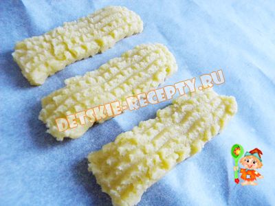 9. На противень стелим бумагу для запекания и сверху на нее выкладываем кусочки теста. Разогреваем духовку до 200 градусов и печем детское печенье на протяжении 20 минут. Слишком румянить печенье не нужно – оно будет более полезным, если останется бледным.