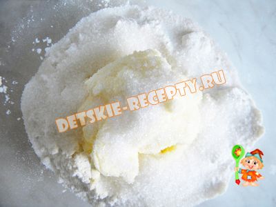 4. К муке добавляем мягкое сливочное масло и тщательно растираем эти два ингредиента. Ложкой это будет сделать сложно, поэтому лучше размешивать рукой.
