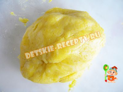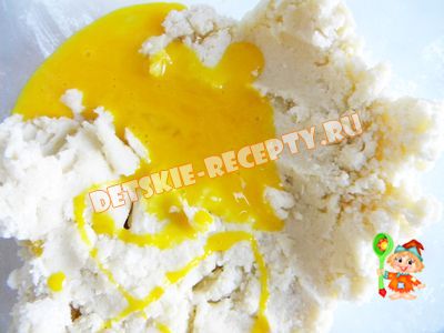 6. В самом конце добавляем в тесто для детского печенья желток и хорошенько вымешиваем тесто рукой.
