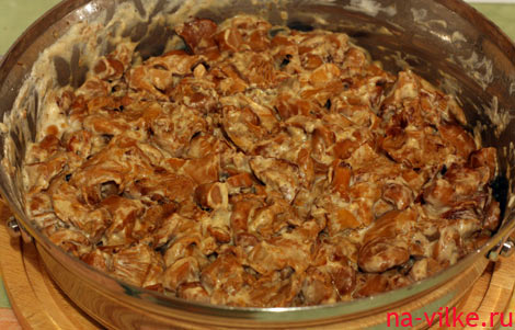 - Грибы приготовить как в предыдущих рецептах, а грудку, нарезанную соломкой, обжарить отдельно.