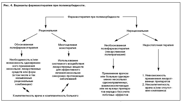 Мы выделяем рациональный и нерациональный варианты фармакотерапии при полиморбидности. Условием успешного применения и достижения цели при рациональном варианте является компетентность врача и больного. В таком случае эффект достижим при использовании обоснованной технологии, когда в связи с клинической необходимостью и при фармакологической безопасности больному назначают одновременно несколько лекарственных средств или форм.