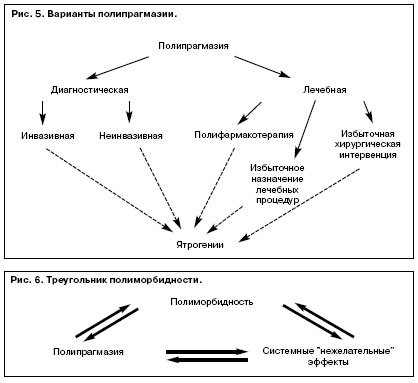 Уместно вспомнить мнение известного терапевта И.Мадьяра (1987 г.), который, исходя из принципа единства лечебно-диагностического процесса, предложил более широко трактовать понятие «полипрагмазия». Он считает, что лечебной полипрагмазии нередко предшествует полипрагмазия диагностическая (избыточные действия врача, направленные на диагностику заболеваний, в том числе с использованием суперсовременных, как правило, дорогостоящих методов исследования), а диагностическая и терапевтическая полипрагмазия, тесно переплетаясь и провоцируя друг друга, порождают бесчисленные ятрогении. Оба вида полипрагмазии порождаются, как правило, «недисциплинированным врачебным мышлением» .