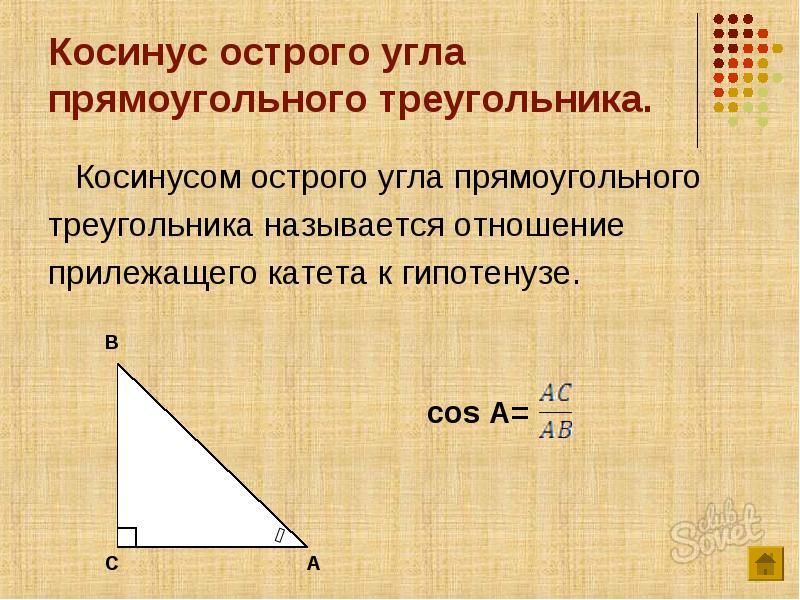Косинус угла (cos) – это отношение прилежащего катета к гипотенузе. Формула: cos=b/c, где b – катет, прилежащий к данному углу, а с – гипотенуза. Преобразуем формулу и получим: b=cos*c.