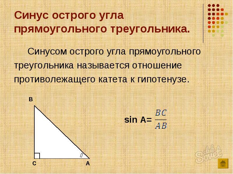 Синус острого угла равен отношению противолежащего катета к гипотенузе