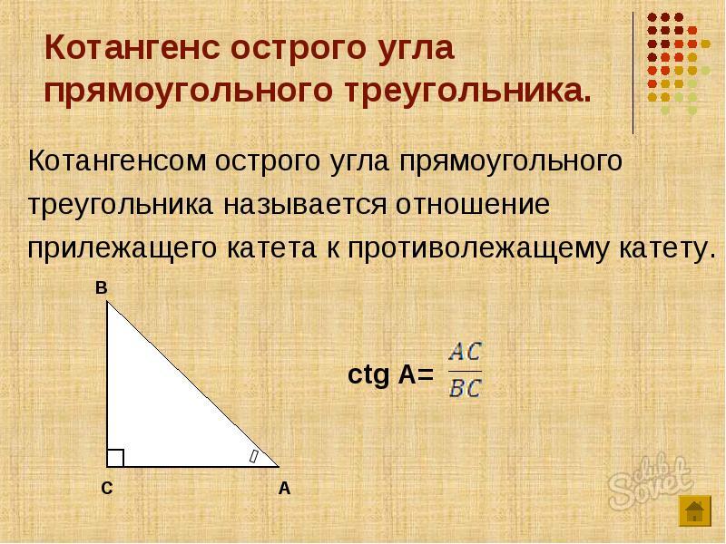 Котангенс острого угла равен отношению прилежащего катета к противолежащему катету.