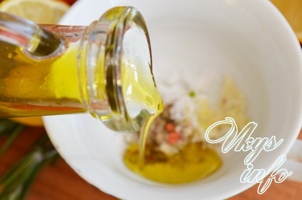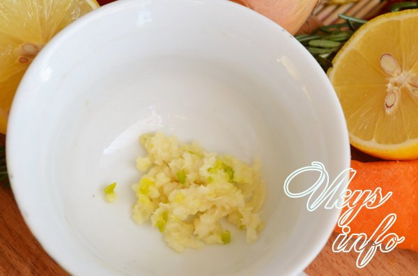 Чеснок мелко нарубил, положил его в чашку вместе с солью и перцем, выдавил сок из половинки лимона и налил 50 мл оливкового масла.