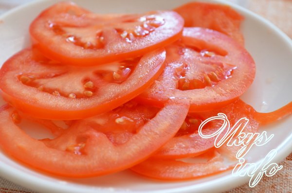 - Помойте помидор, нарежьте тонкими кружочками, разложите сверху.