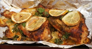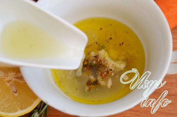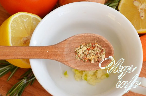 Полил настоем шафрана, а затем смесью из чеснока с лимонным соком и маслом.