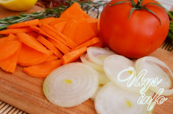 - Пока маринуется окунь, приготовьте овощи: почистите морковь и лук, нарежьте лук тонкими полукольцами, морковь – половинками или четвертинками кружков, в зависимости от размера.