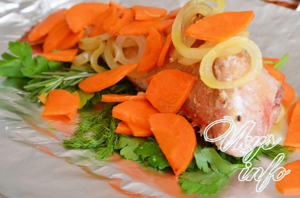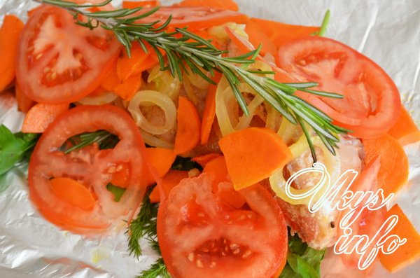 - Фольгу сложите пополам и сделайте из нее «лодочку». На дно ее постелите зелень, на нее положите окуня. Сверху разложите морковь и лук.