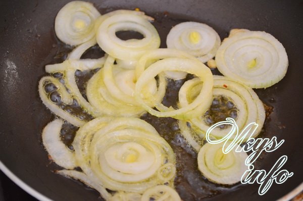 - Половину оставшегося масла вылейте на сковороду и обжарьте в нем лук.