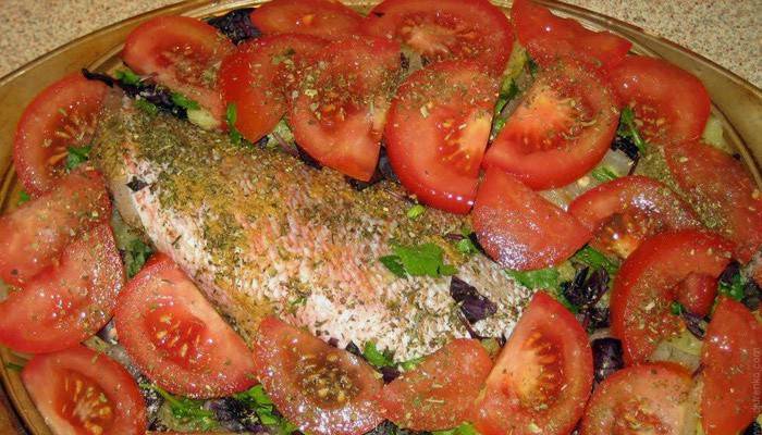 Запекаем рыбку в заранее разогретой духовке при 240 градусах. Обязательно каждые 5 — 7 мин. поливайте ее соком, чтоб верхние помидоры и сама рыбка не высохли.