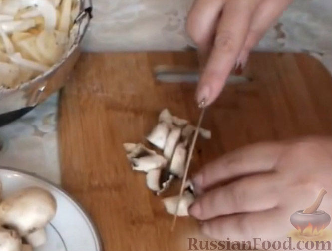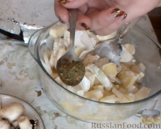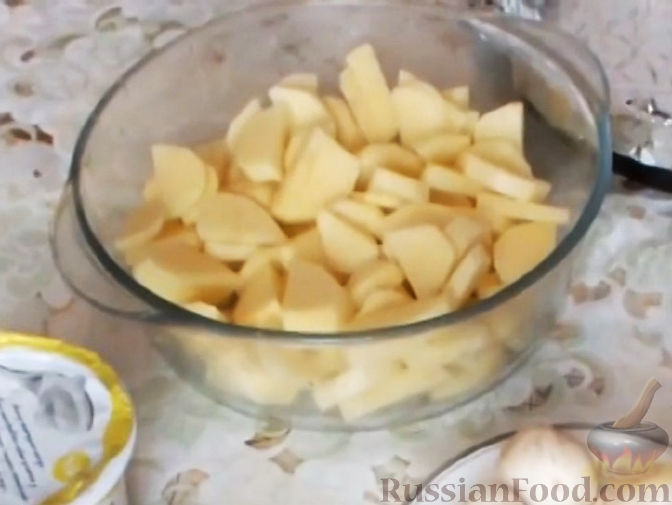 - Очистите картошку. Нарежьте тонкими кружками. Молодой картофель запекается быстрее, поэтому лучше использовать для приготовления блюда именно такой. Если картофель старый, то нарезать его следует совсем тонкими слайсами.