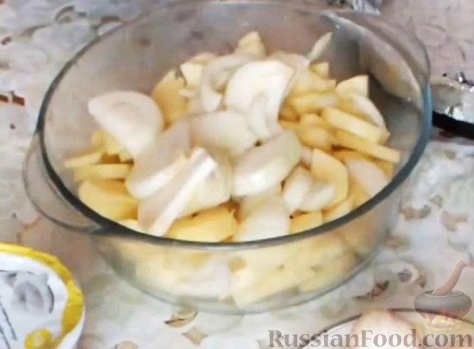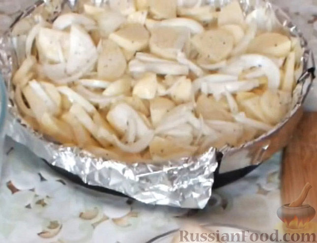 - Положите на рыбу луковые кольца, покройте оставшимся майонезом. Сверху выложите слой картофеля, использовав весь, который остался.