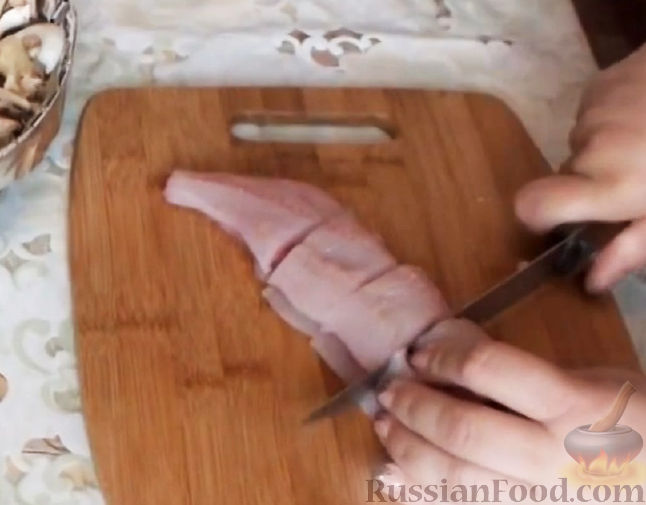- Смешайте соль, перец, мускатный орех и натрите ими куски филе. Через полчаса разрежьте филе на небольшие куски.