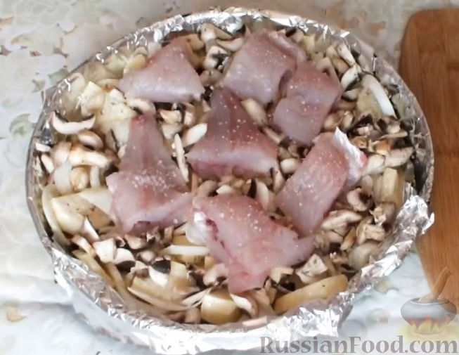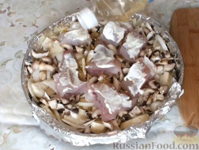 Выложить кусочки рыбы сверху картофеля. Посолить.
