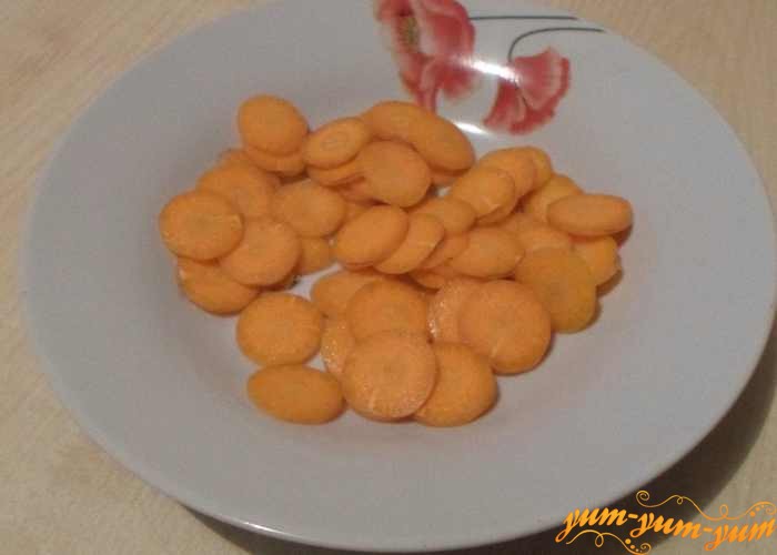 Морковь режем тонкими колечками или соломкой, но можно и воспользоваться обычной крупной теркой.