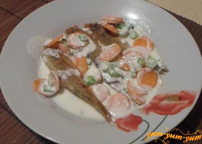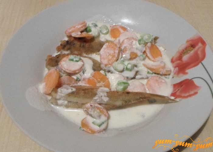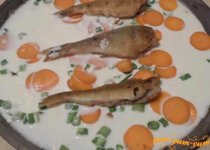 Обжаренную рыбу переложить сверху овощей на противень и залить сметанной водой.