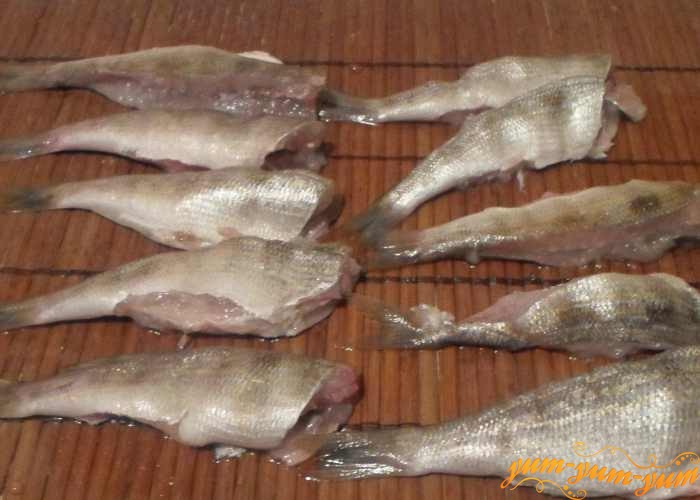Окуня очистить, снять кожу. Разрезать на порционные кусочки.