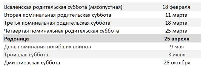 православных христиан, и прежде всего своих почивших родителях. Канонические дни посещения могил предков и других родственников, где совершаются панихиды. Днями особого поминовения усопших в Православной церкви являются пять родительских суббот: Мясопустная вселенская родительская суббота (суббота за 2 недели до Великого Поста); Троицкая вселенская родительская суббота (суббота перед днем Святой Троицы, на 49-й день после Пасхи); родительская 2-я суббота Великого Поста; родительская 3-я суббота Великого Поста; родительская 4-я суббота Великого Поста.