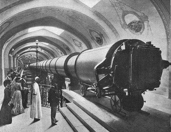 В далёком 1900 году в Париже прошла Всемирная астрономическая выставка. Специально для экспозиции было сконструировано изобретение, ставшее самым большим в мире телескопом-рефрактором. Его фотография представлена выше.