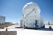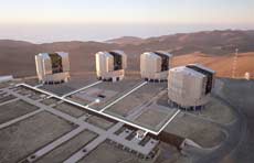 В 1998 г. несколько европейских стран построили в горах Чили «Очень Большой Телескоп» — Very Large Telescope (VLT. Это четыре телескопа с зеркалами по 8, 2 м. если все четыре телескопа работают в режиме одного целого, то яркость получаемого изображения — как у 16-метрового телескопа. Снимок ESO.