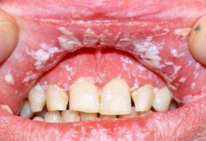 Обычно данный тип кандидоза поражает щеки и язык. У пациента наблюдают белесые пятна и бляшки на слизистых, форма которых может быть абсолютно разной. Пораженные области могут воспаляться, появляется покраснение вокруг белых пятен. Если вовремя не принять меры, то грибок приведет к озлокачествлению пораженных участков слизистых. У курильщиков намного выше риски развития хронического гиперпластического типа.