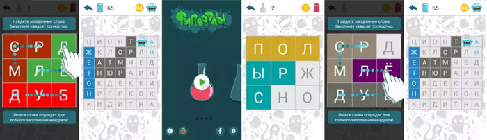 Всем любителям головоломок и сканвордов посвящается игра «Филворды». Здесь вам необходимо из предложенных букв собирать слова. Поначалу задача кажется лёгкой, ведь количество слов не очень большое.