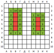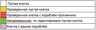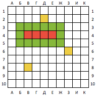 В соответствии с принятыми выше обозначениями, на рисунке жёлтым отмечены те клетки, по которым уже были произведены безуспешные выстрелы, красным отмечены клетки, выстрелы по которым закончились попаданием, а зелёным отмечены клетки, стрельба по которым не производилась, но можно гарантировано утверждать, что кораблей в них нет (кораблей там быть не может, т.к. по правилам игры корабли не могут соприкасаться).