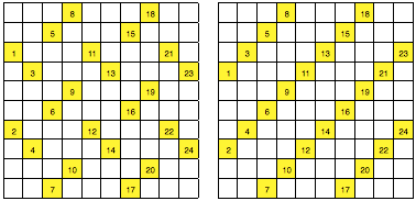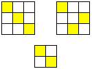 Для начала давайте рассмотрим участок игрового поля размером 4 на 4 клетки. Если в рассматриваемом участке есть вражеский линкор, то его гарантировано можно подбить не более чем за 4 выстрела. Для этого надо стрелять так, чтобы на каждой горизонтали и вертикали было ровно по одной проверенной клетке. ниже представлены все варианты такой стрельбы (без учёта отражений и поворотов).