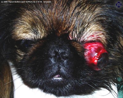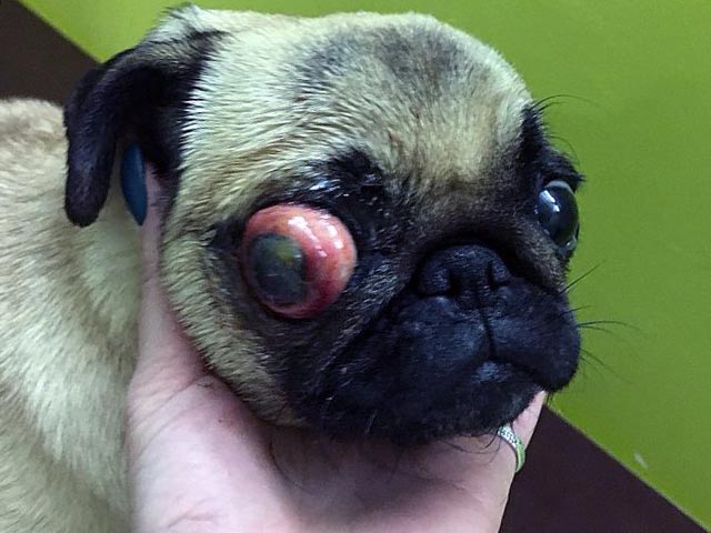 Выпадение глазного яблока частая причина обращения владельцев с собаками-брахиоцефалами, анатомическими особенностями которых являются приплюснутая морда, очень широкая глазная щель, глаза как бы «навыкате».
