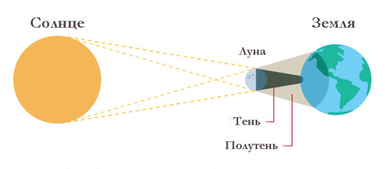 Солнечное затмение происходит, когда Солнце, Луна и Земля выстаиваются на одной прямой линии, астрономы называют такое явление сизигия. Во время затмения Луна проходит между Солнцем и Землей, отбрасывая тень на Землю, а с точки зрения земного наблюдателя Луна заслоняет (затмевает) Солнце, частично или полностью. Такое небесное явление может случаться только во время новолуния.