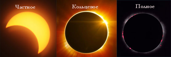 В зависимости от того, насколько сильно ушло в тень Солнце, затмения бывают полными, частными и кольцевыми. Последние касаются периодов, когда Луна проходит по диску Солнца, но оказывается меньше Солнца в диаметре, и не может скрыть его полностью.