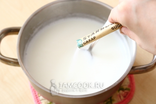 В закипевшее молоко всыпаем соль и сахар, перемешиваем.