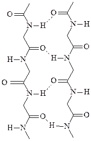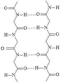 , насыщенной водородными связями, каждый участок цепи β-складчатости открыт для образования дополнительных водородных связей. Боковые радикалы аминокислот ориентированы почти перпендикулярно плоскости листа попеременно вверх и вниз.
