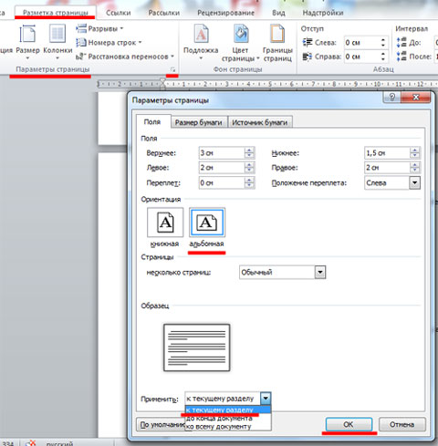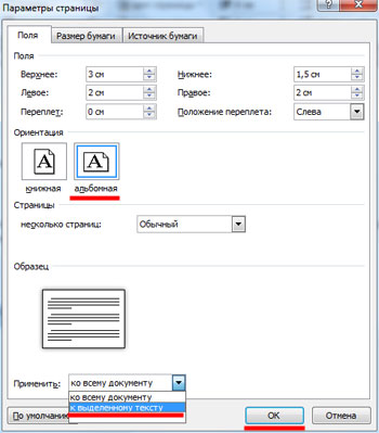нажмите на стрелочку. В следующем окне выберите альбомную ориентацию, и в поле «Применить»
